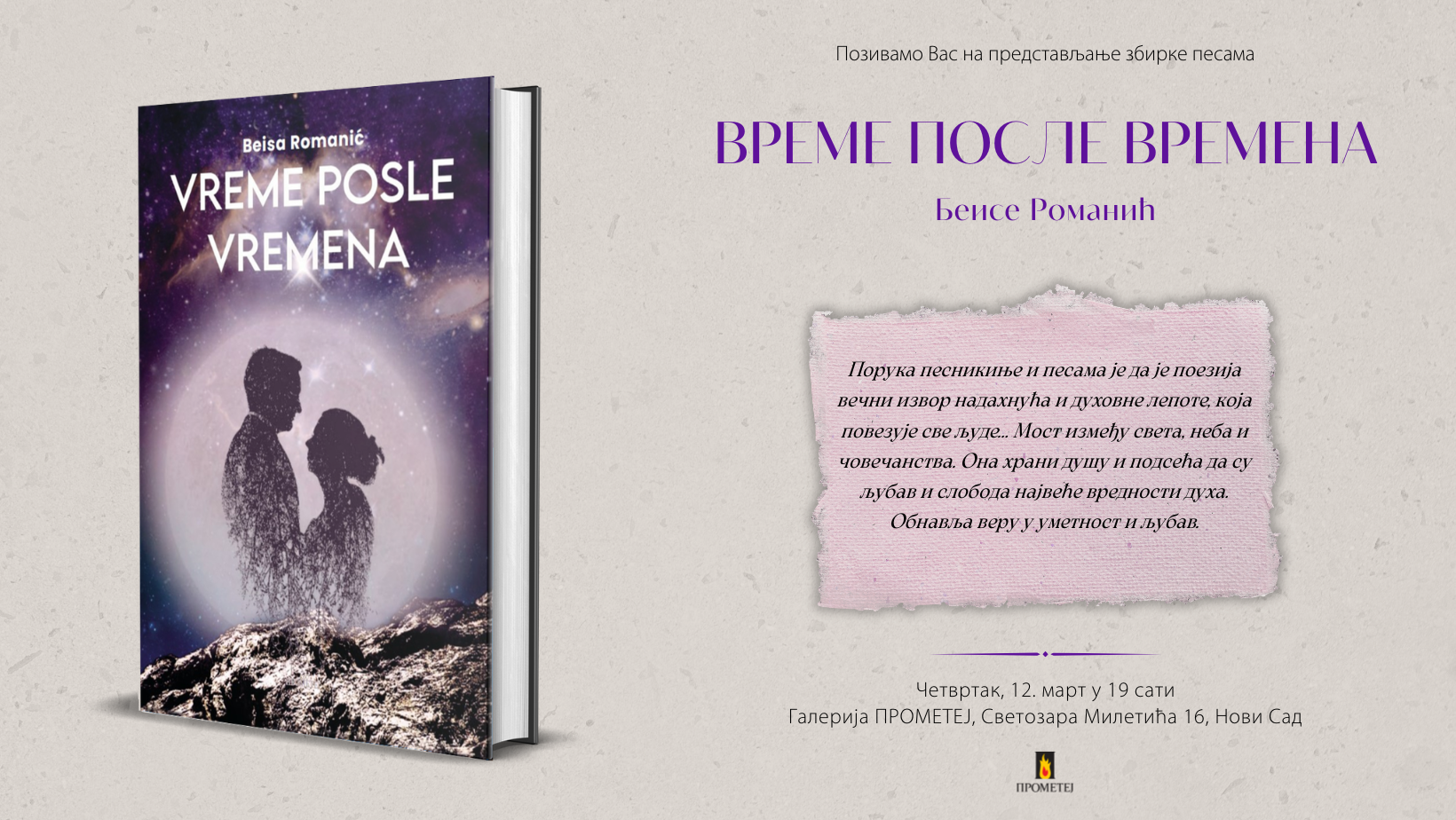 Издавачка кућа Прометеј вас позива на промоцију збирке песама „Време после времена”, ауторке Беисе Романић у галерији Прометеј (Светозара Милетића 16, Нови Сад) у четвртак, 12. марта у 19 часова.
